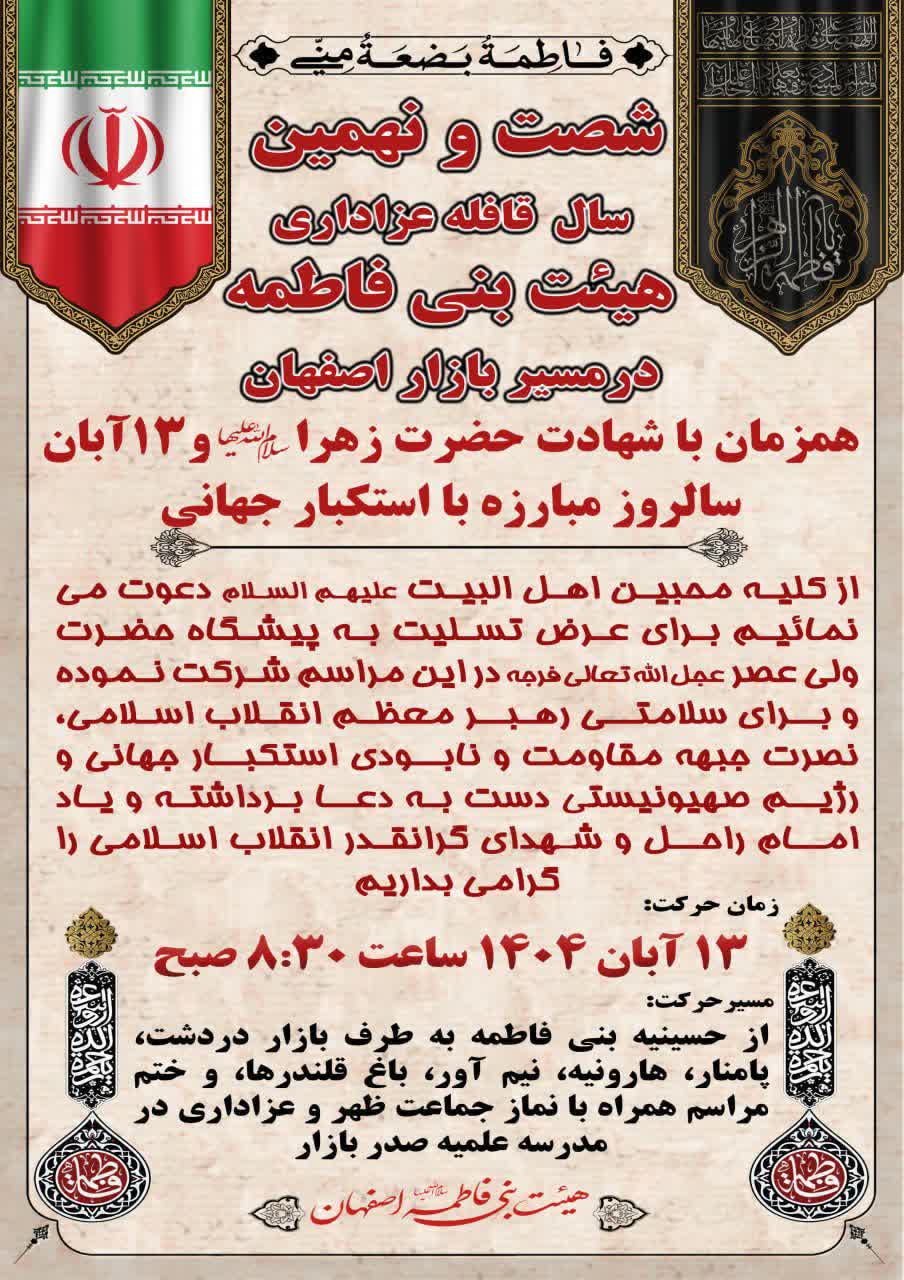 🚩شصت و نهمین سال حرکت قافله عزاداری هیئت بنی فاطمه در مسیر بازار اصفهان همزمان با سالروز شهادت حضرت زهرا سلام الله علیها و ۱۳ آبان روز ملی مبارزه با استکبار جهانی